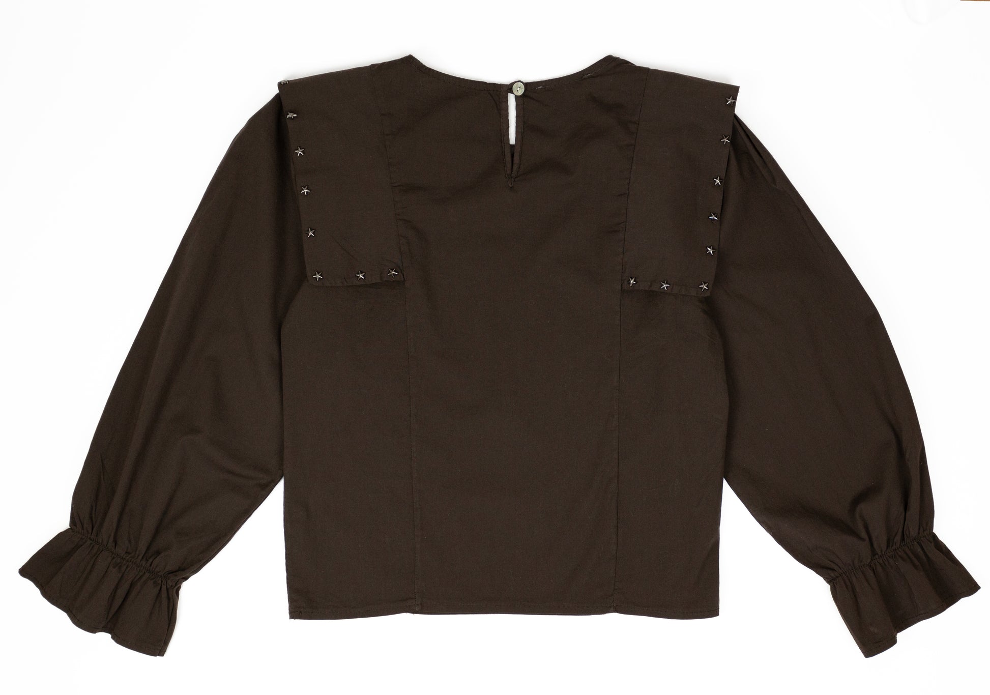 Camisa chocolate con hombreras bordadas y mangas abullonadas