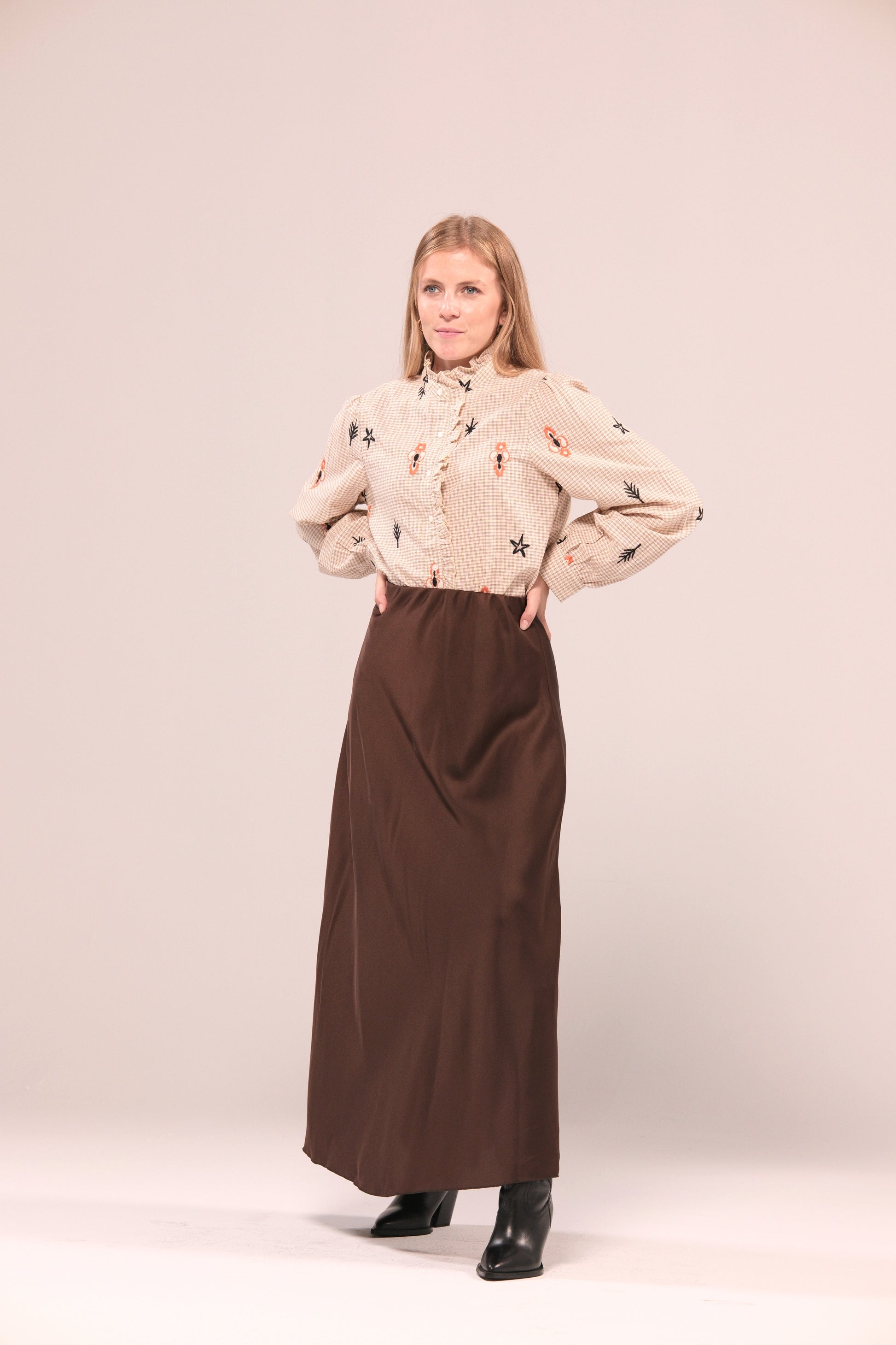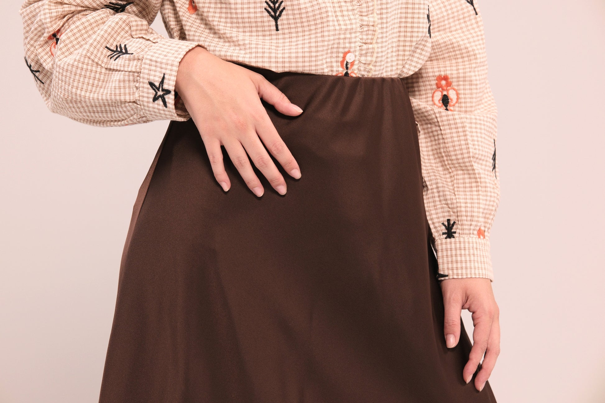 La falda midi satinada en color chocolate es un básico atemporal que combina sencillez y elegancia. Su tejido satinado aporta una caída ligera y movimiento fluido, convirtiéndola en la prenda ideal para ocasiones especiales o para elevar un look cotidiano.