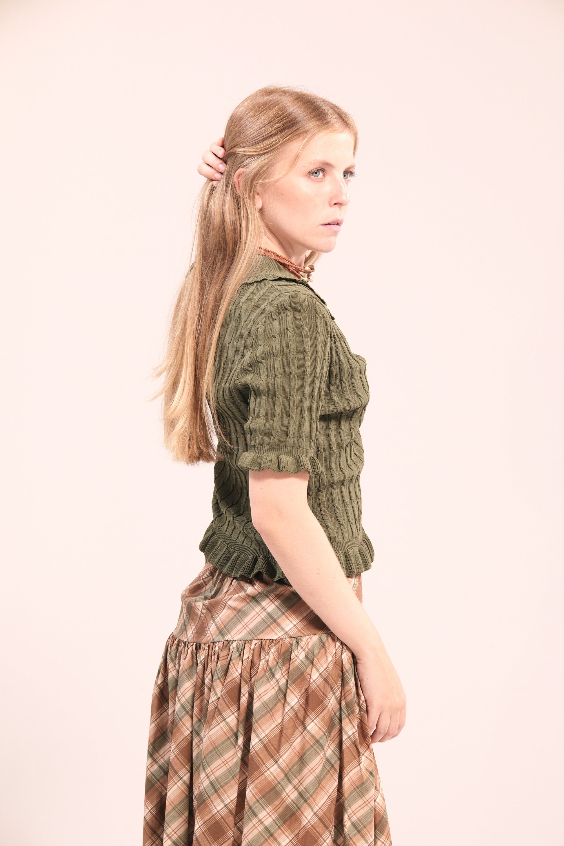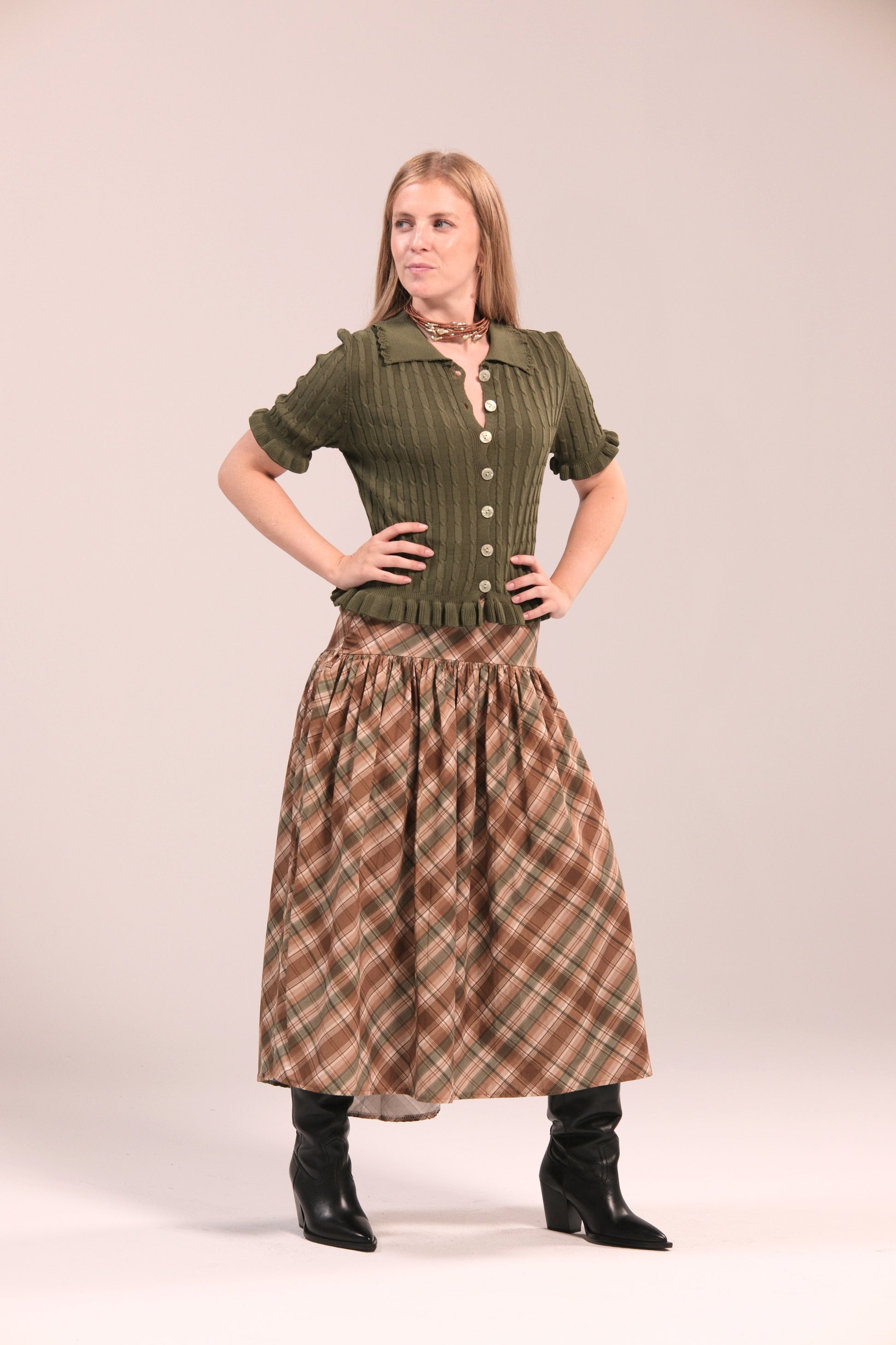 La falda midi de cuadros en tonos marrón, beige y verde es la prenda versátil que estabas buscando. Su diseño con fruncido en la cintura aporta comodidad y un ajuste favorecedor, mientras que el corte ligero deja libertad de movimiento.