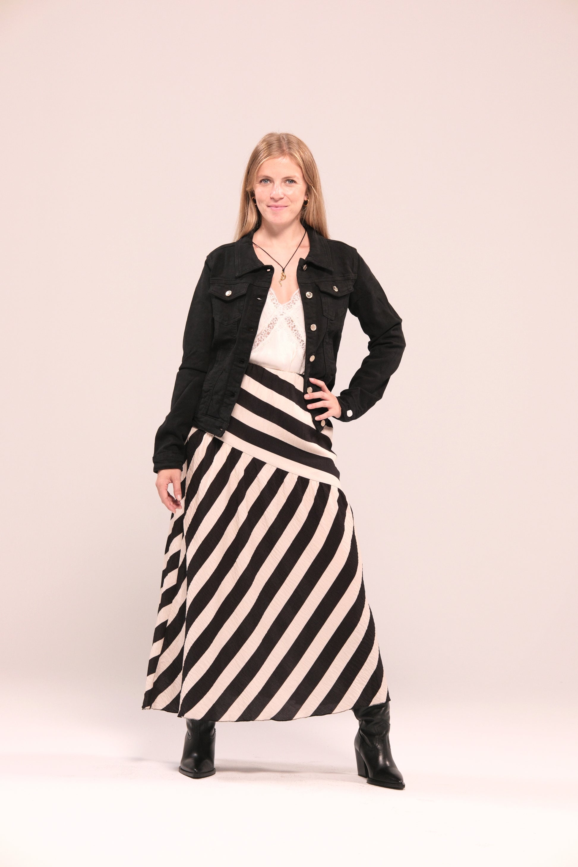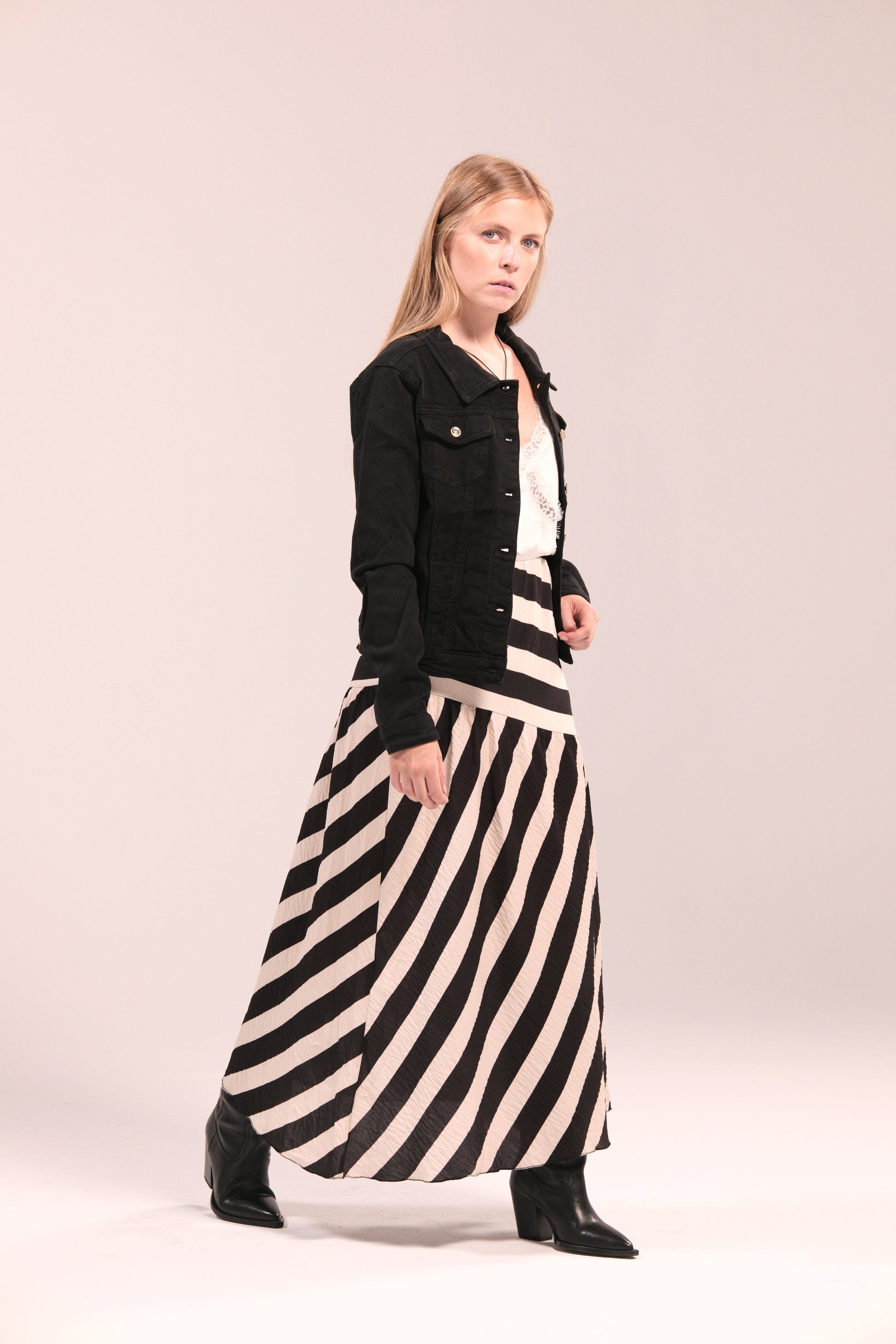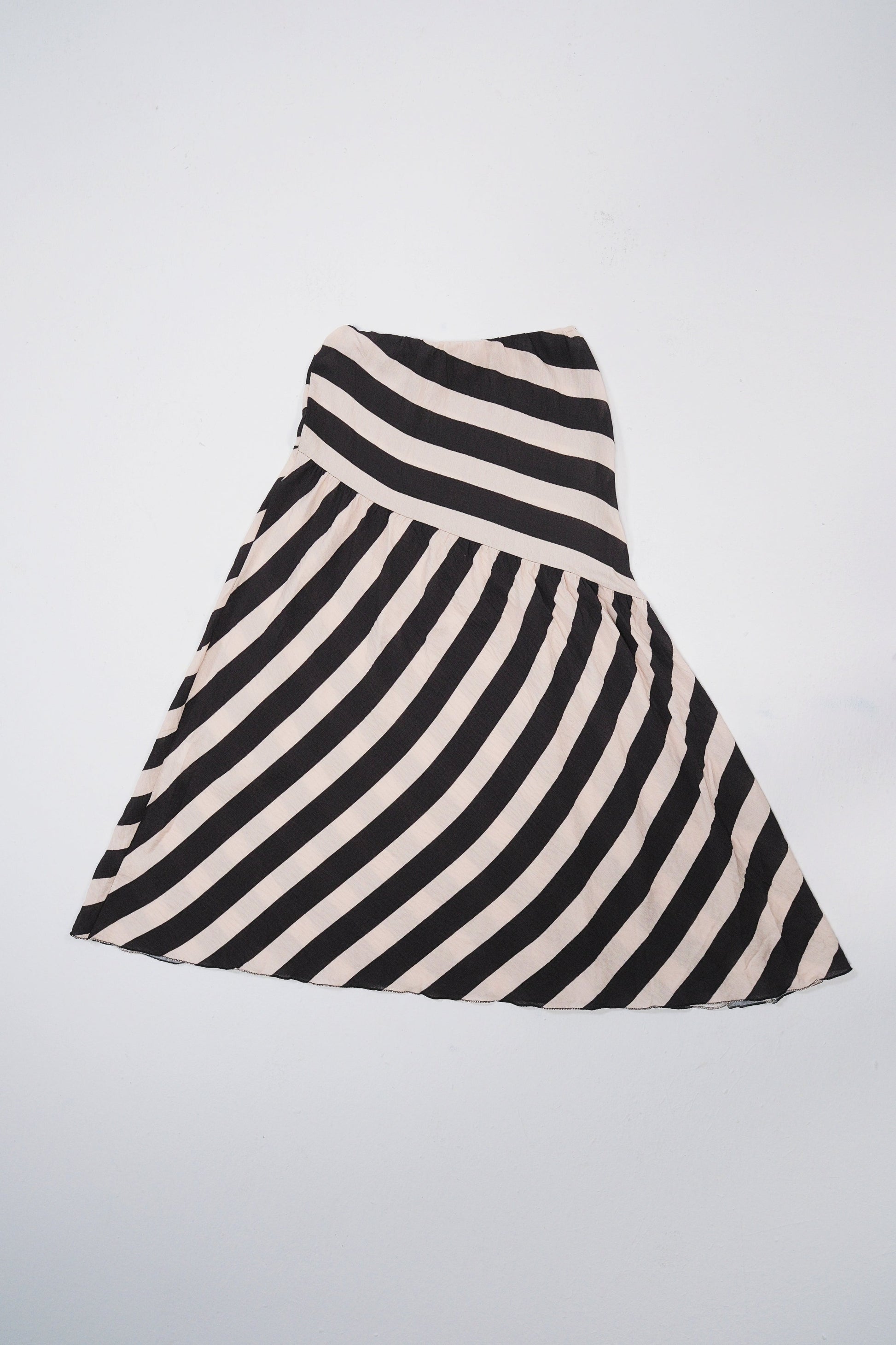 La falda midi de rayas en blanco y negro es una pieza atemporal que aporta estilo sin esfuerzo. Con diseño evasé y cintura fruncida, se adapta con comodidad y favorece a cualquier silueta.