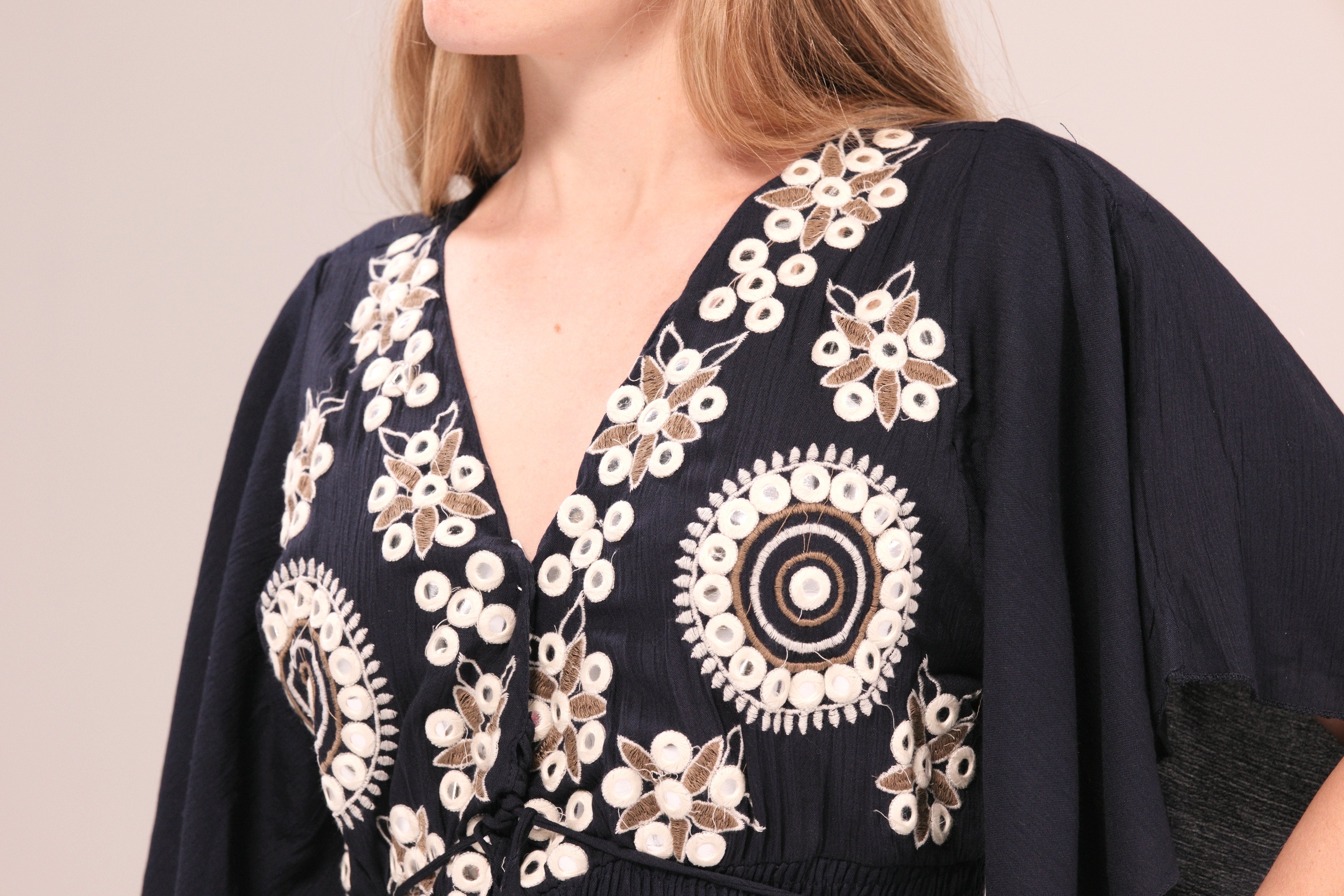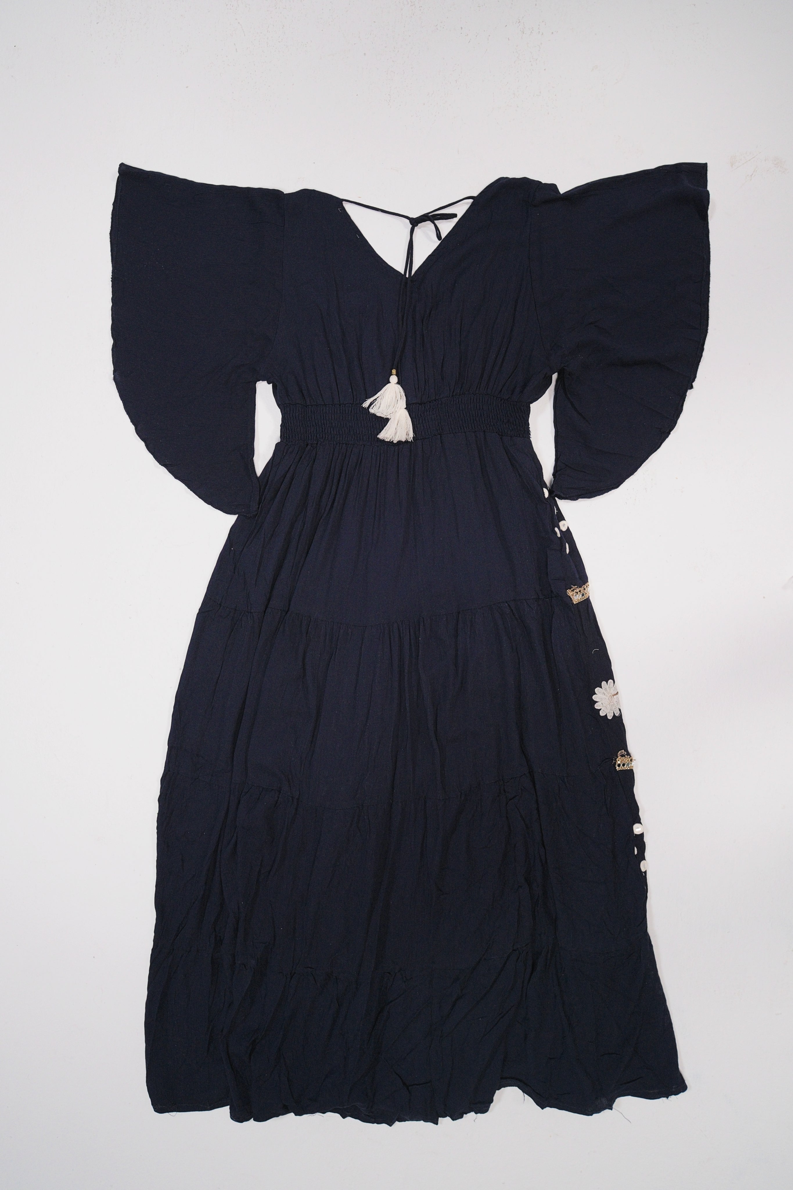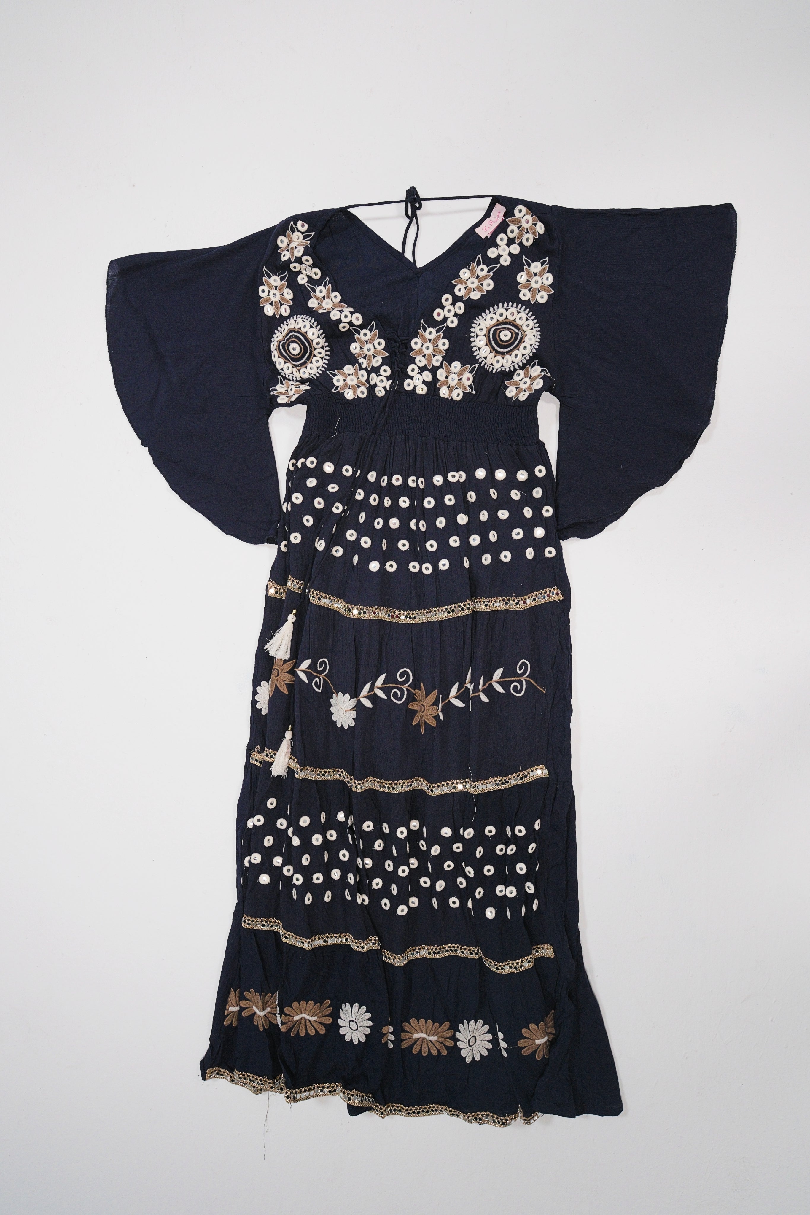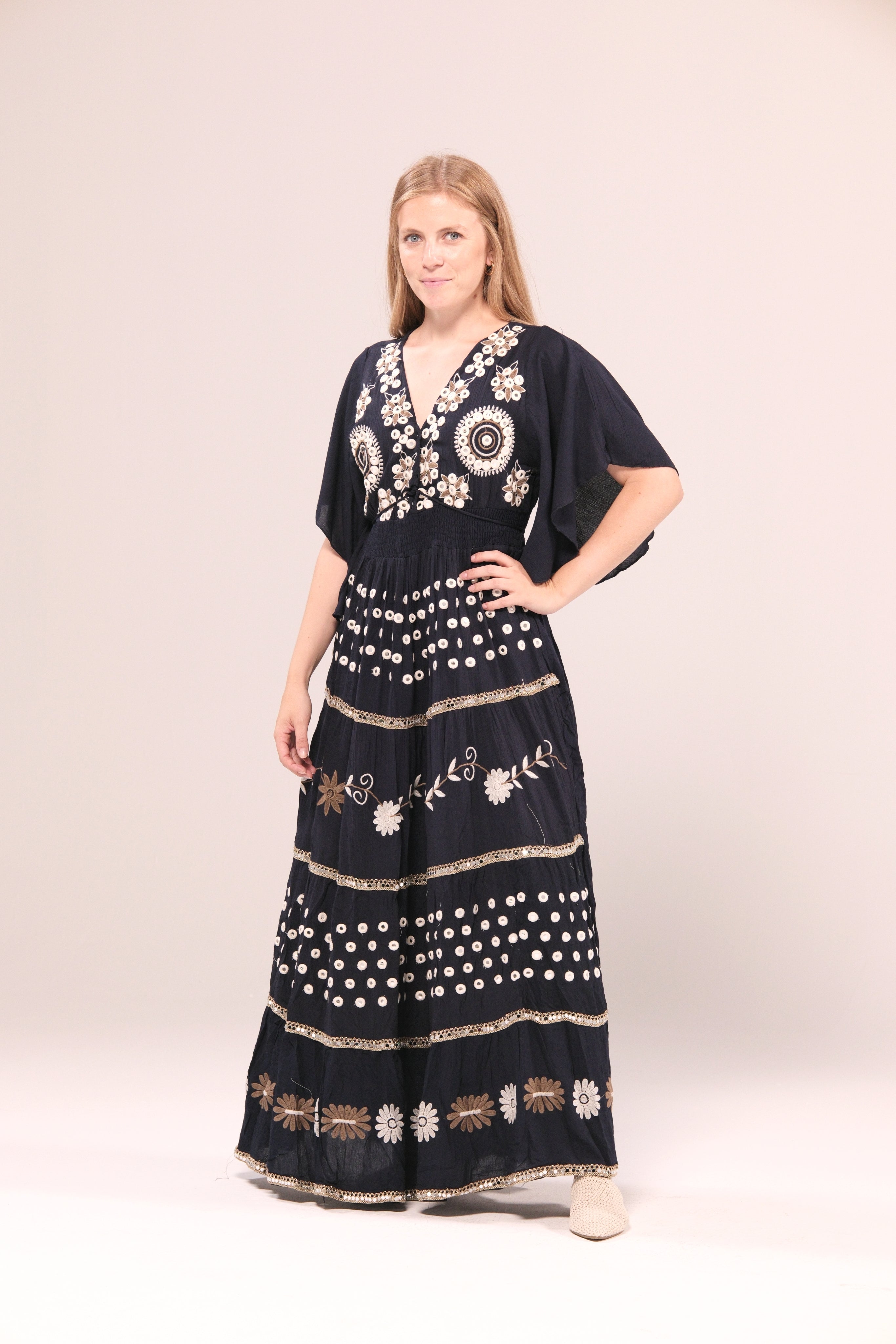 Un vestido bohemio y elegante en color negro, con bordados florales y detalles artesanales que lo convierten en una prenda única.